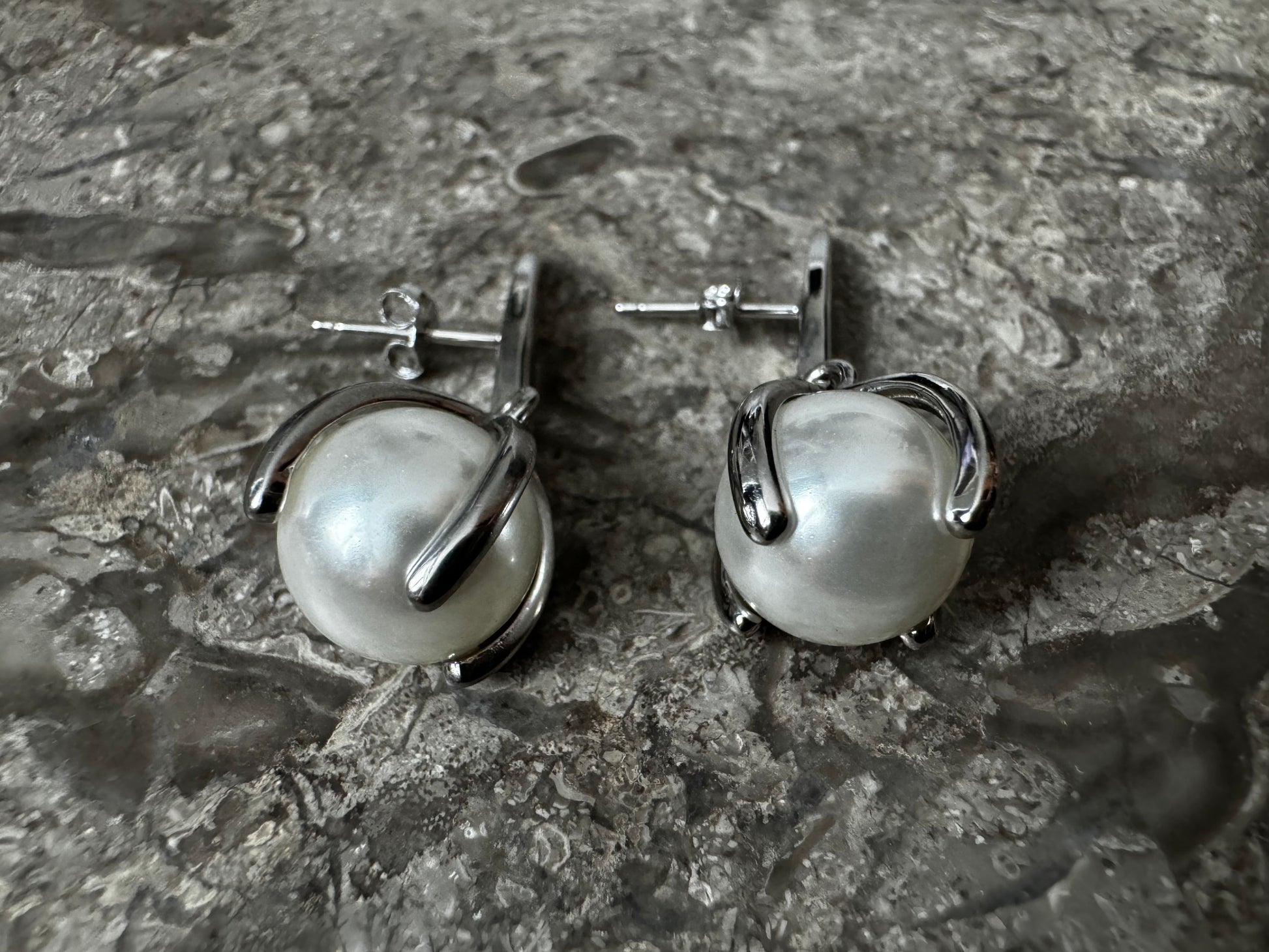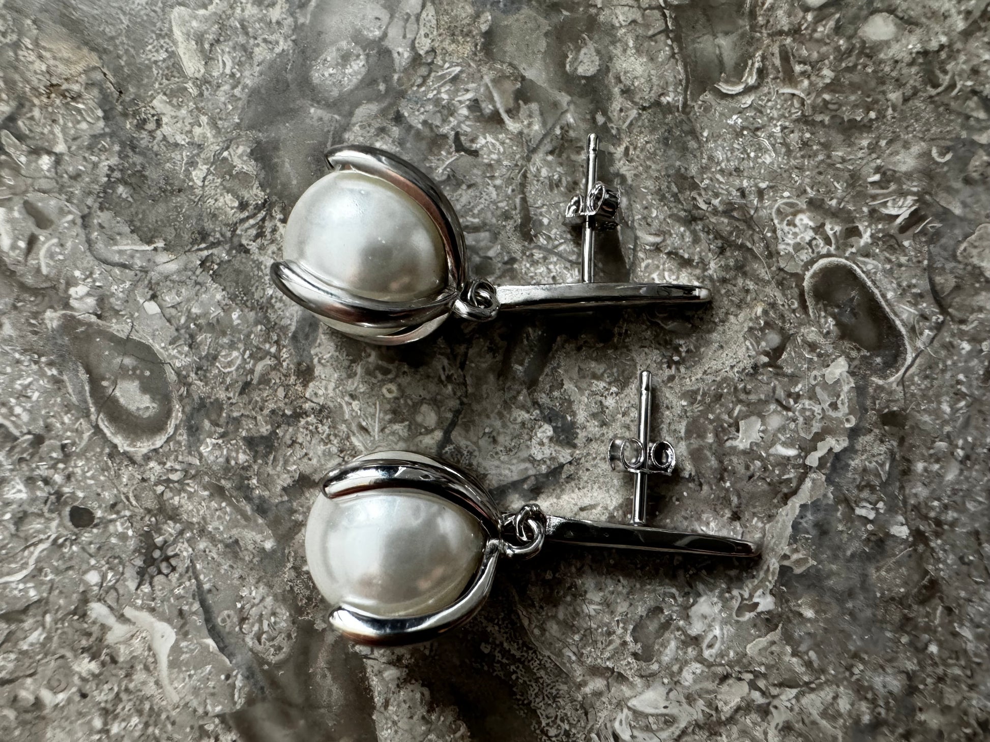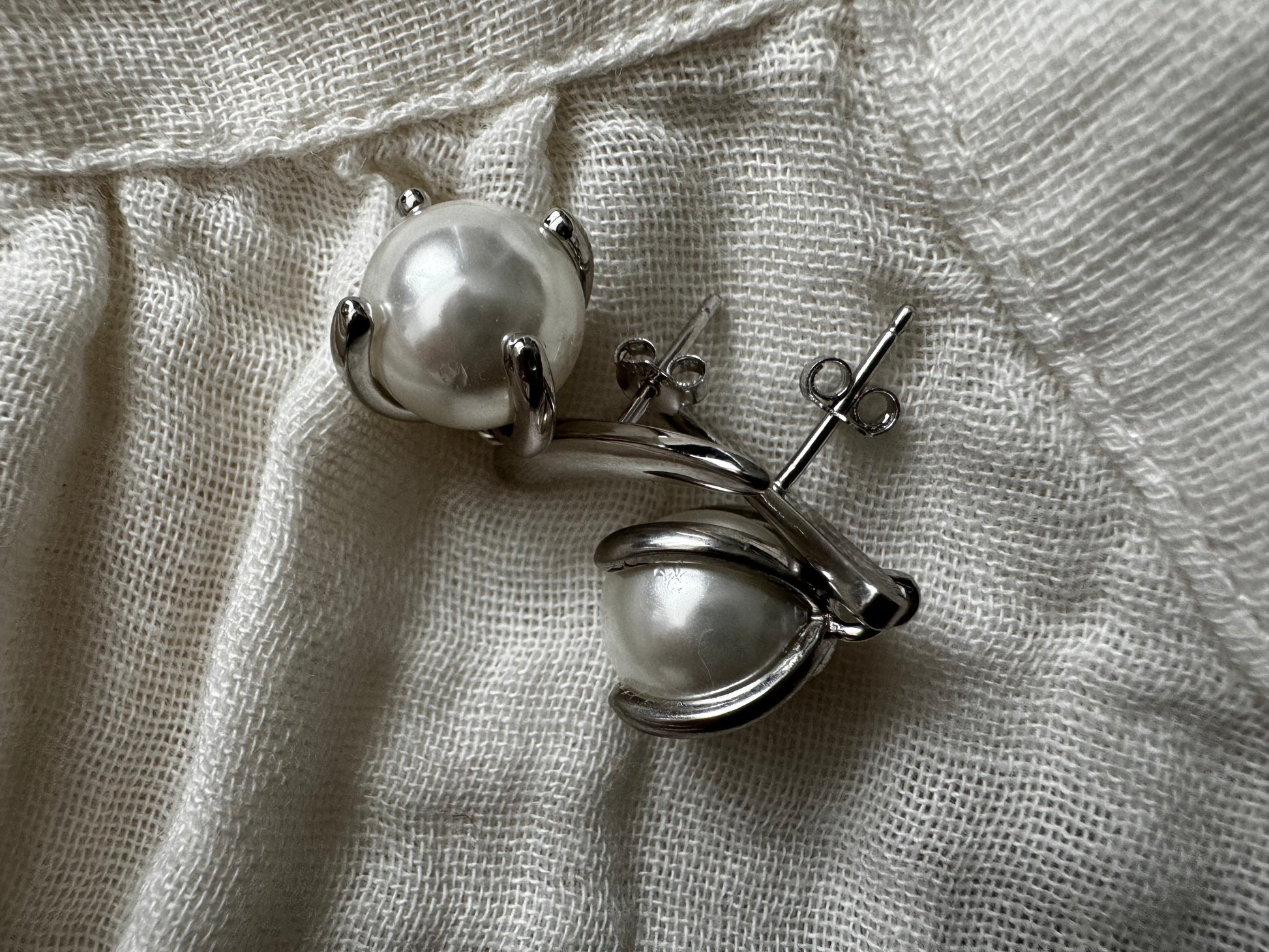 Silver pearl earrings.