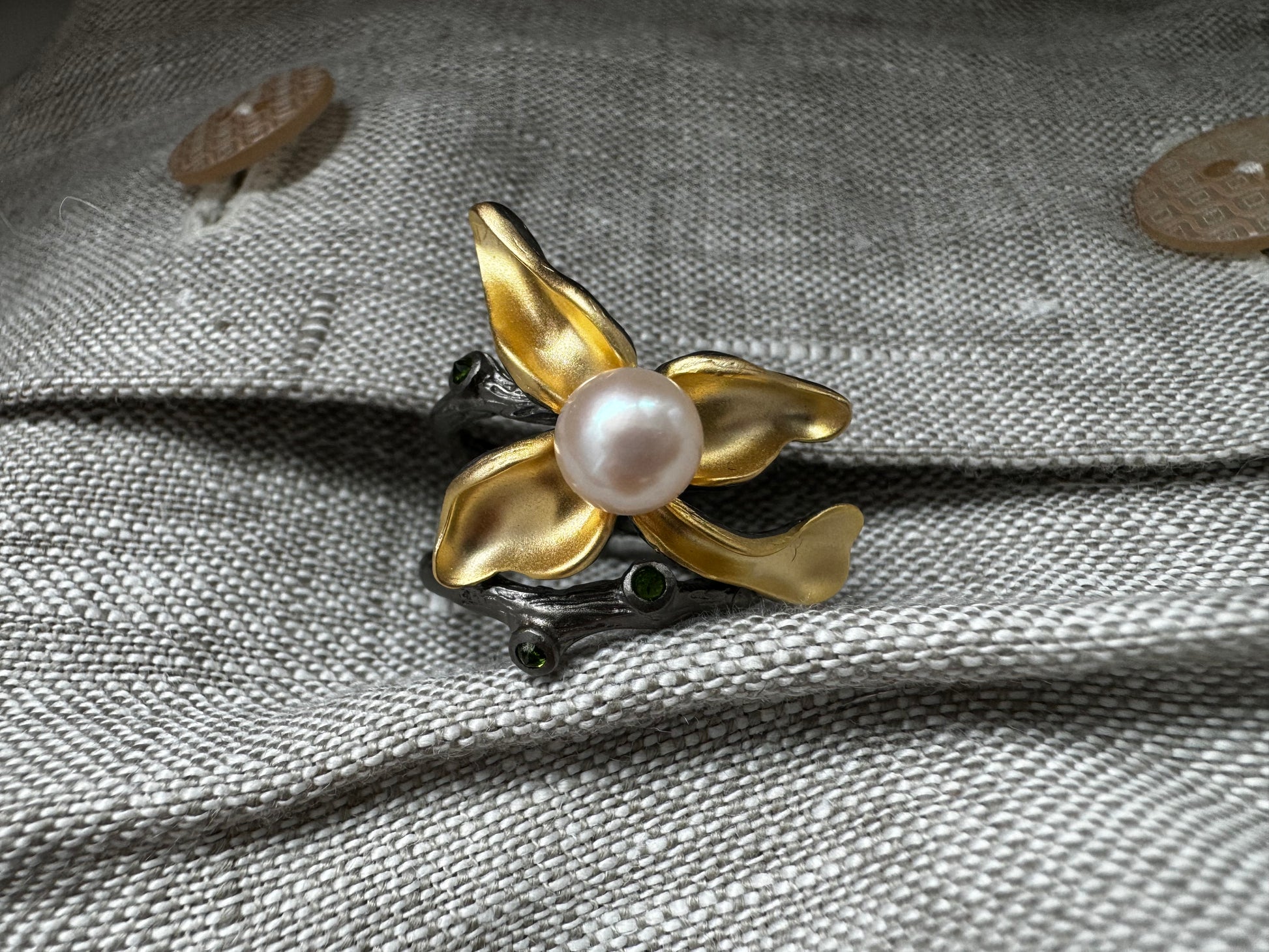 Silver gold 18k plated ring with freshwater pearl and diopsides
